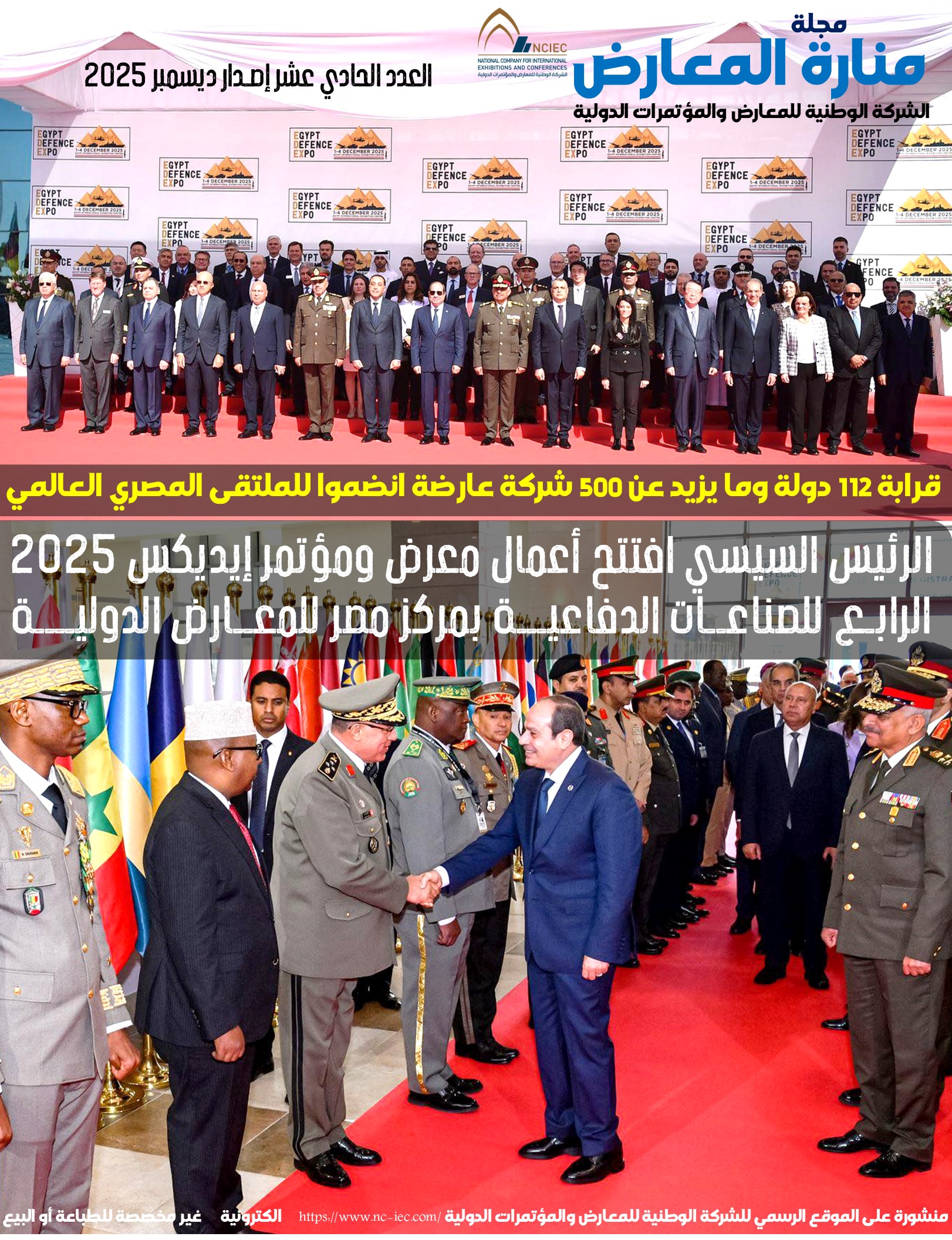 أصدرت الوطنية للمعارض والمؤتمرات الدولية العدد 11 من مجلة منارة المعارض ديسمبر 2025 حيث عنونت الغلاف الرئيسي لها بافتتاح الحدث العالمي الأكبر من نوعه على المستويين الإقليمي والعالمي بمعرض ومؤتمر مصر الدولي الرابع للصناعات الدفاعية إيديكس والذي افتتحه السيد الرئيس عبد الفتاح السيسي رئيس الجمهورية القائد الأعلى للقوات المسلحة بمشاركة قرابة 25 جناحاً دولياً بجانب ما يزيد عن 500 عارضاً من صفوة نخب الصدارة الأولى في صناعة وتحديث المعدات العسكرية يمثلون ما يناهز 112 دولة بجانب وفود رسمية على أعلى مستوى. كما ضم محتوى العدد الجديد نخبة ممتازة من أبرز الفعاليات الهامة التي تمت بنجاح لافت في مركزي مصر للمعارض والمنارة للمؤتمرات الدوليين خلال النصف الثاني من الموسم التشغيلي 2025 بجانب الثوابت الرئيسية للإصدار.المنارة استضافت مؤتمر ومعرض شرم ديرما الطبي للتجميل أكتوبر 2025